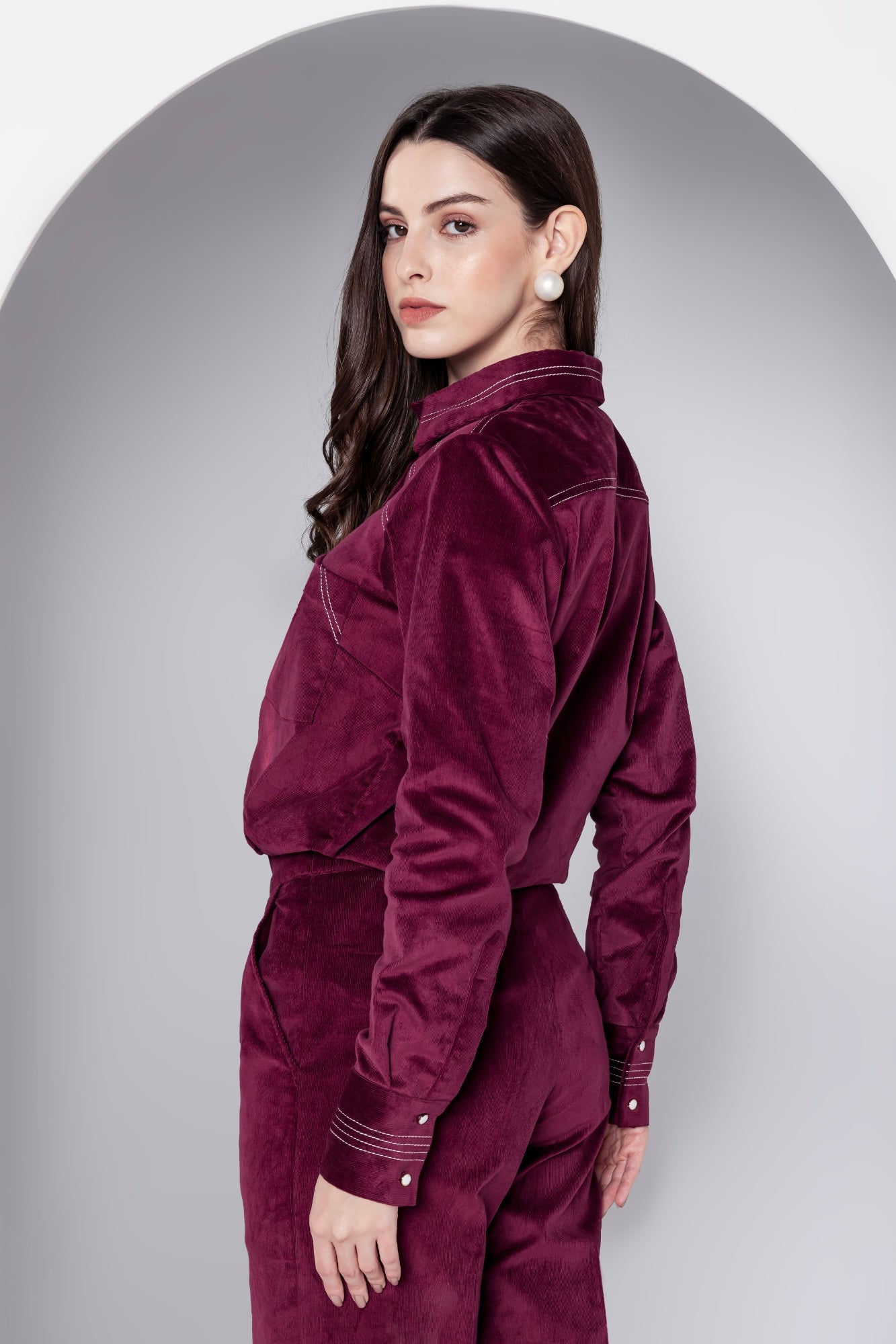 Pair it with matching Bordeaux corduroy pants and gold-toned accessories for an effortlessly elegant ensemble that transitions seamlessly from day to evening.