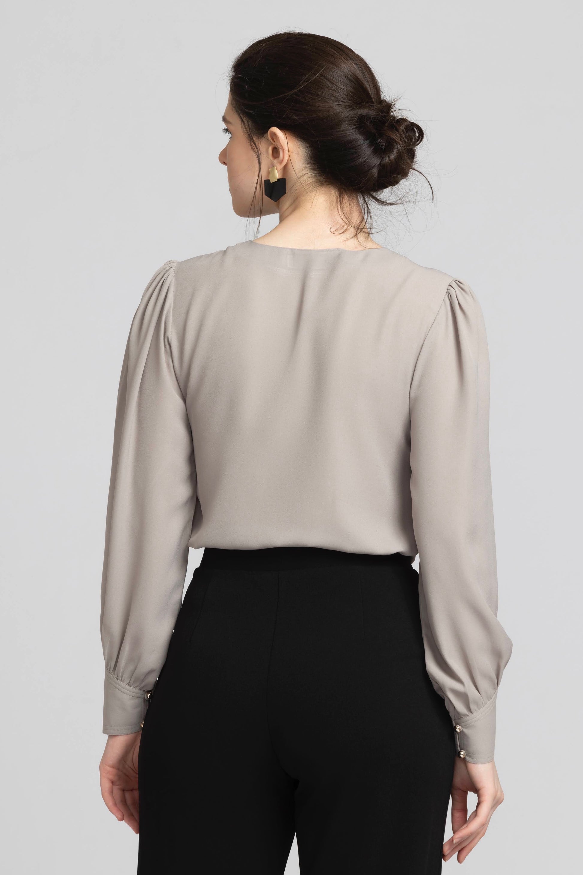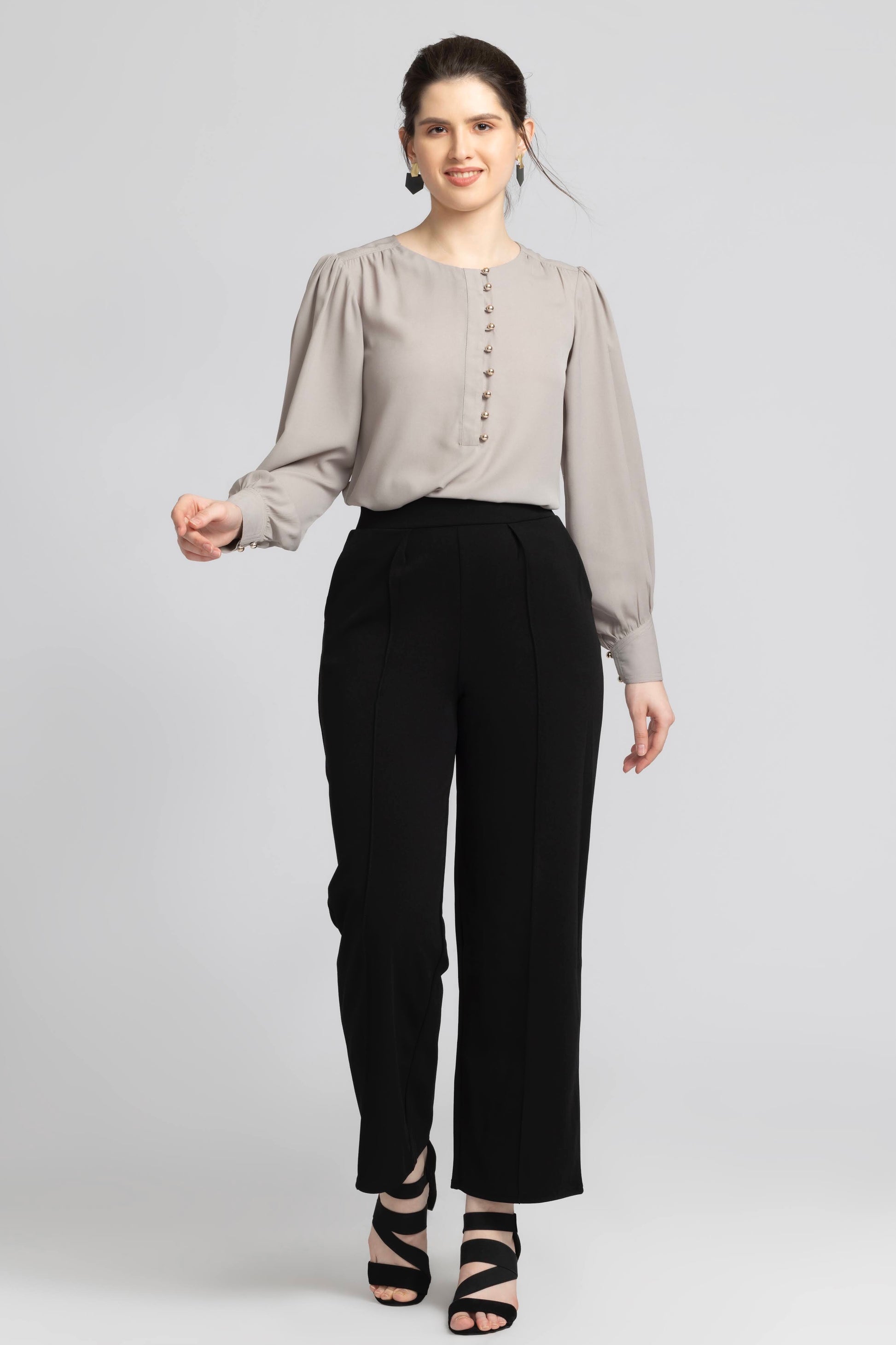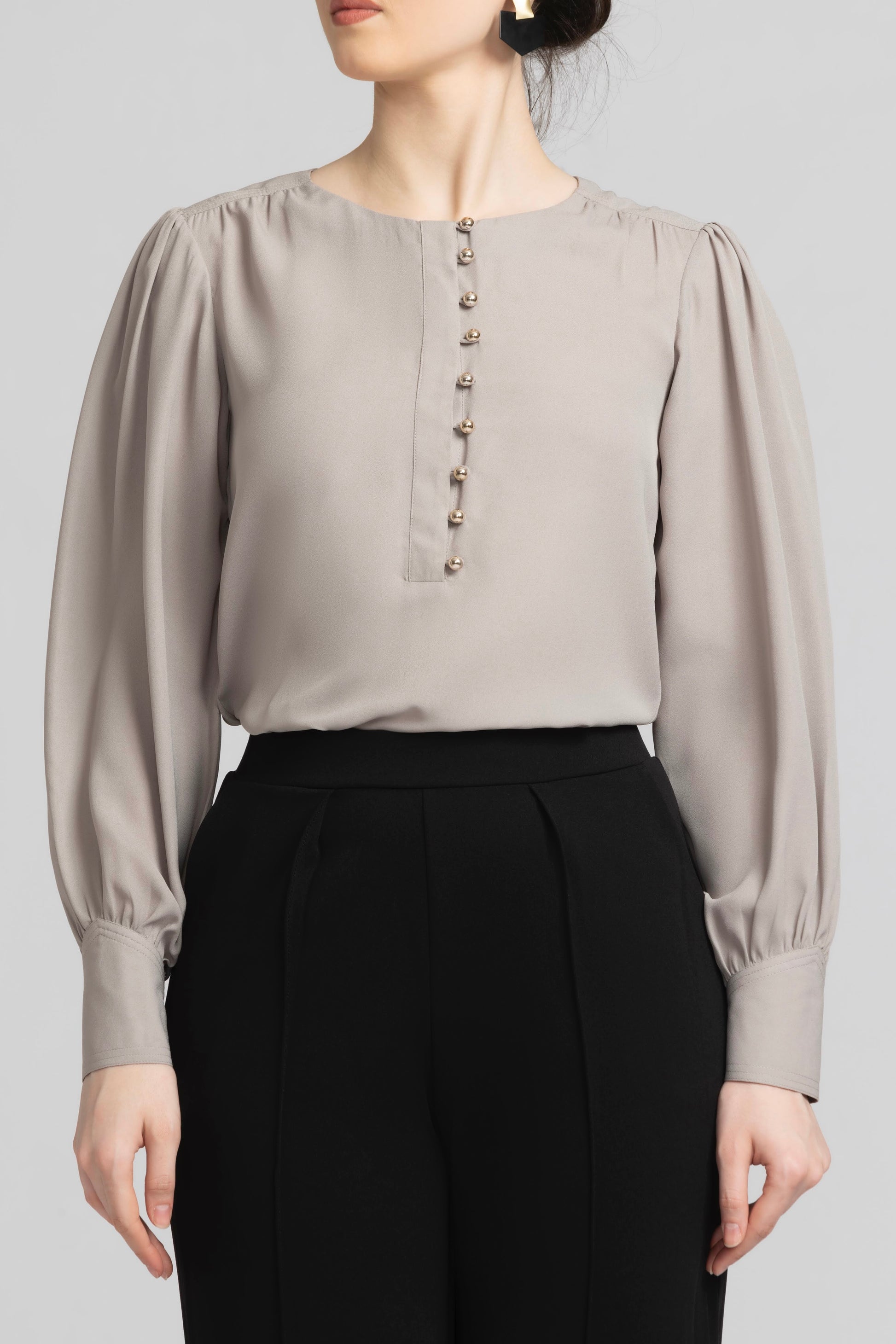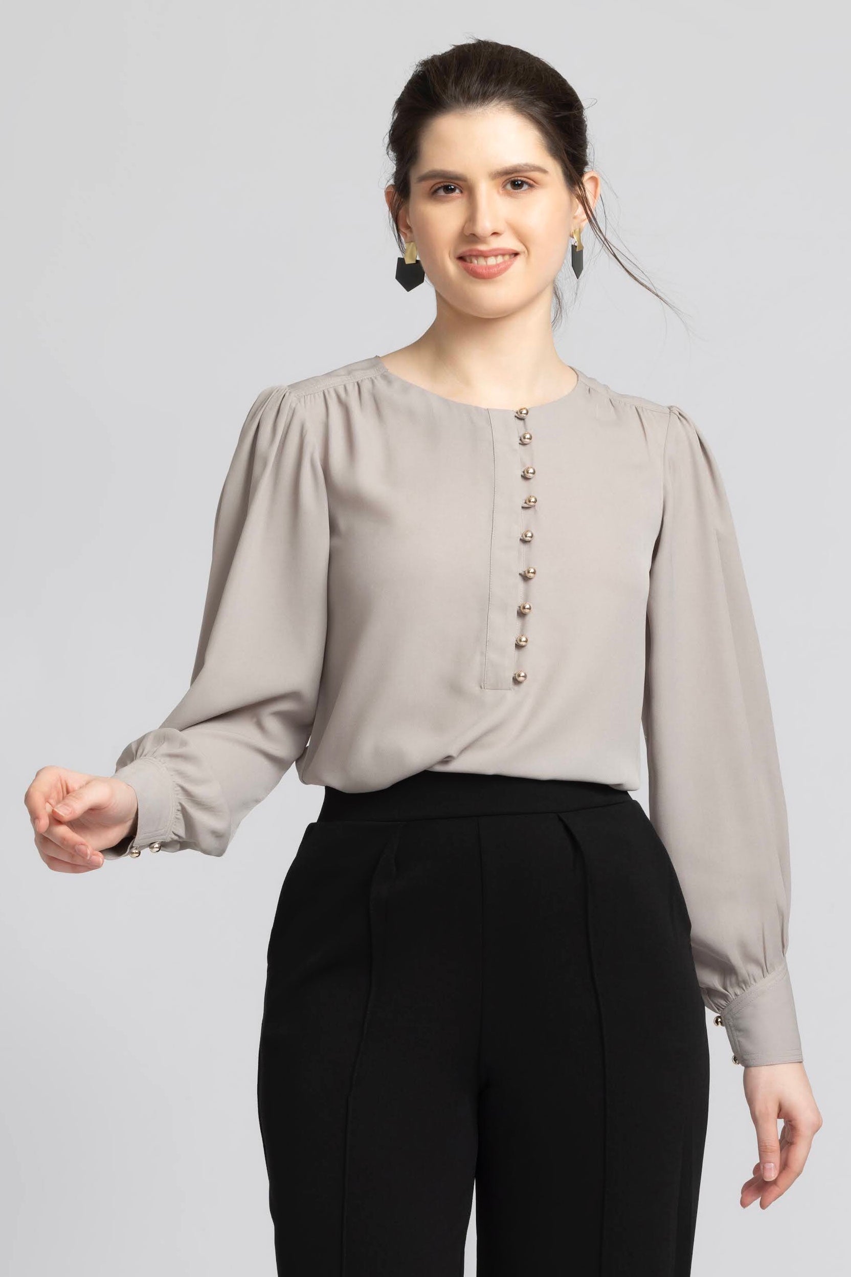 Experience contemporary elegance with our Ethereal Grey Elegance Top. Crafted from summer-cool fabric in a soft light grey hue, it epitomizes modern sophistication. The full-buttoned long sleeves and round neck design create a refined silhouette that is both timeless and on-trend. Elevate your style effortlessly with this captivating piece, embodying the essence of understated glamour and showcasing your confident, contemporary taste.